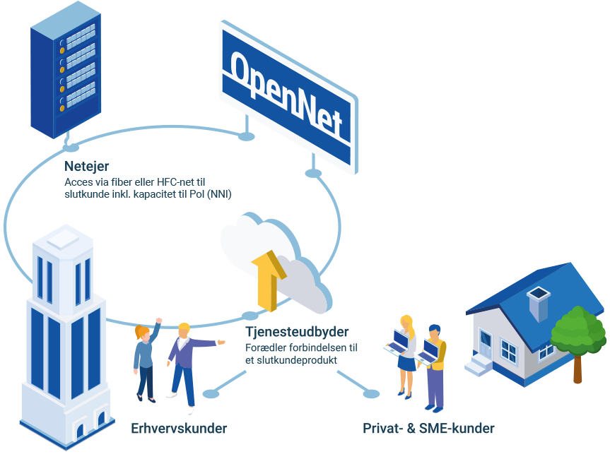 Hos os møder du et enkelt setup, hvor alle produkter følger BSA-definitionen. Vi har defineret få, enkle produktgrupper, som du som tjenesteudbyder kan bestille hos de netejere, som vi hos OpenNet samarbejder med. Det betyder, at du som tjenesteudbyder får mulighed for at sammensætte netop de slutkundeprodukter, som dine kunder efterspørger. Det dækker alt fra den almindelige slutkunde og op til de store entrepriseløsninger.